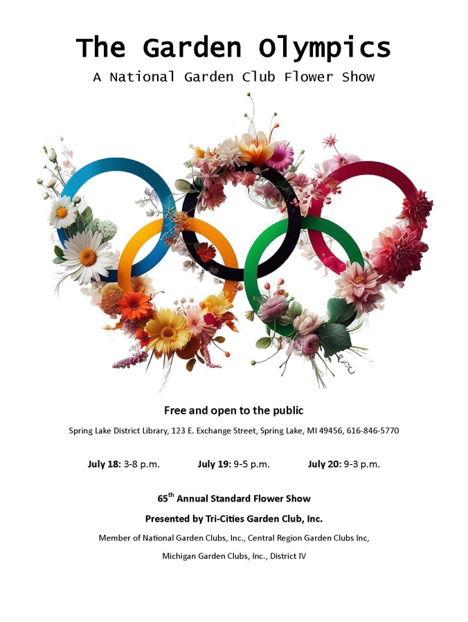 “The Garden Olympics”, the 2024 TCGC flower show will be July 18, 19, 20 in 2024 at the Spring Lake District Library in Spring Lake, MI.